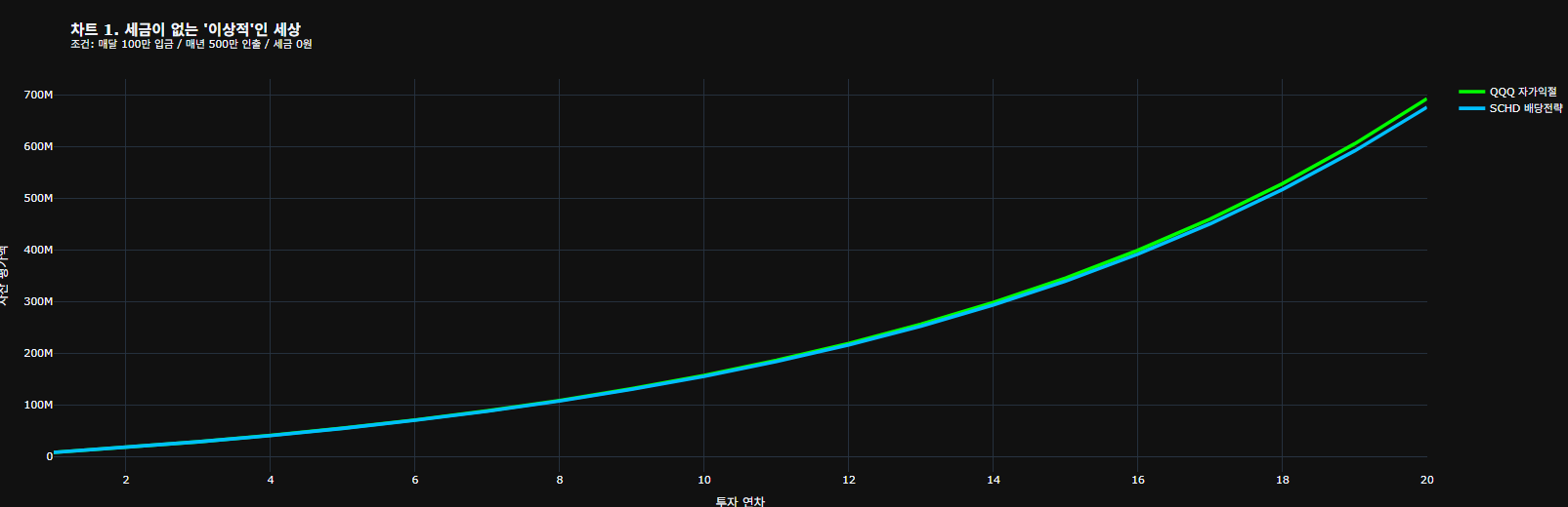 냉정하게 데이터만 보면 명백한 사실이 있습니다. QQQ를 사서 매월 필요한 만큼만 팔아 쓰는 '자가배당 전략'이, SCHD 같은 고배당 ETF를 모으는 것보다 장기 총수익률이 훨씬 높습니다.