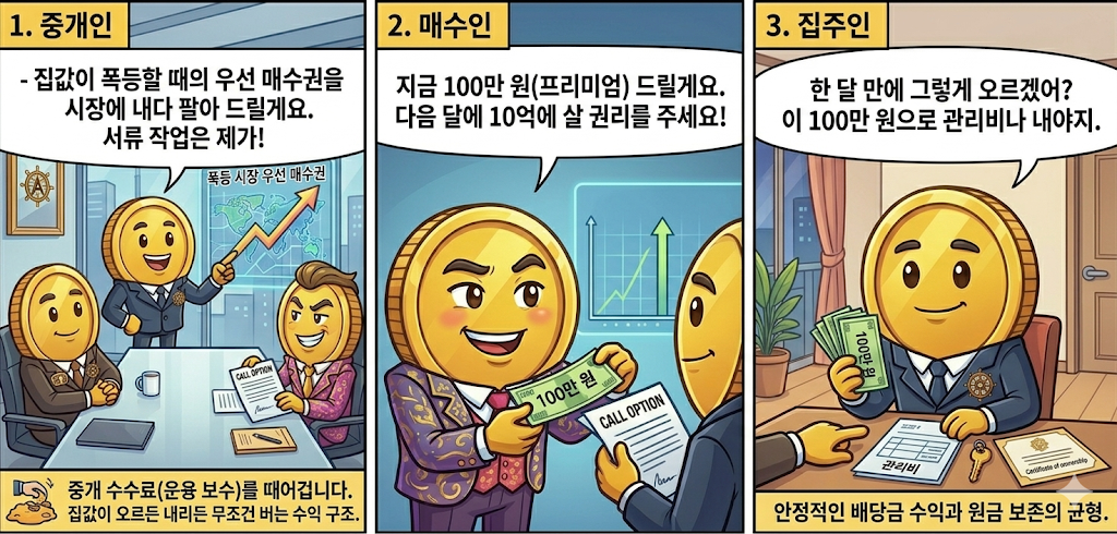 추천 대상: 은퇴자나 당장 대출 이자/생활비 등 매월 고정적인 현금이 절실하게 필요한 사람입니다. 내 자산이 10년 뒤에 10배가 되는 것보다, 당장 이번 달 관리비와 식비를 낼 현금 300만 원이 확실하게 꽂히는 게 훨씬 중요한 분들에게는 커버드콜의 연 10% 배당이 그 어떤 주식보다 훌륭한 효자 상품이 됩니다. (내 아파트값이 오르든 말든, 당장 매월 들어오는 '높은 월세'가 필요한 건물주의 마인드와 같습니다.)